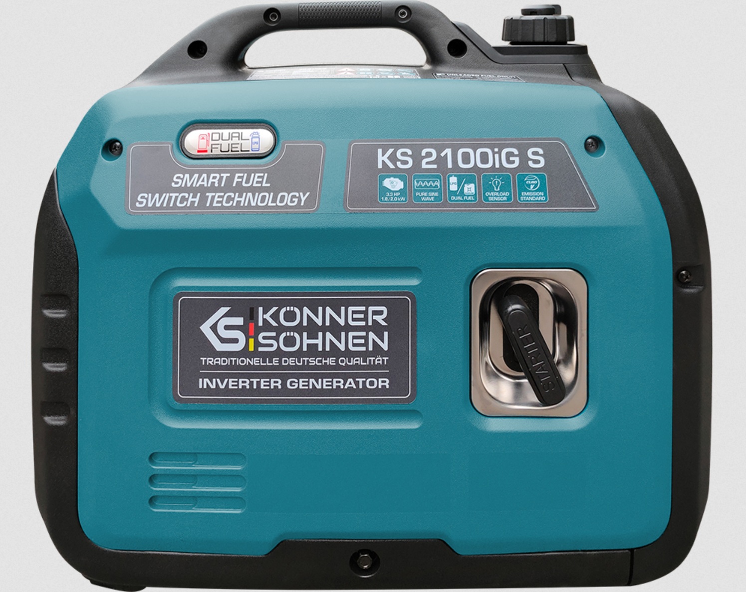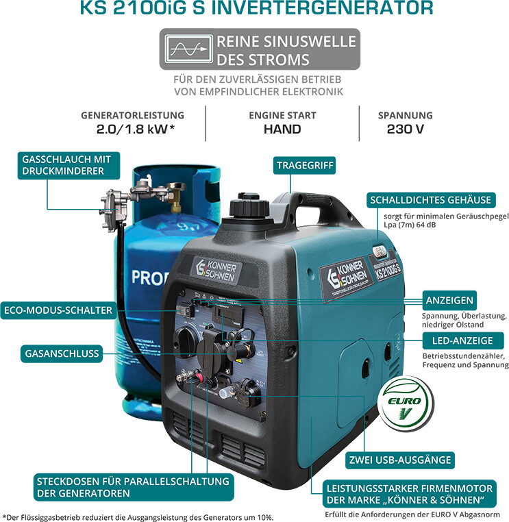 Der KS 2100iG S ist ein kompakter Inverter-Stromerzeuger, der für den autarken Betrieb elektrischer Verbraucher konzipiert wurde. Das Gerät zeichnet sich durch seine Dual-Fuel-Fähigkeit aus: Er kann wahlweise mit bleifreiem Benzin oder Flüssiggas (LPG) betrieben werden. Ein passender Gasschlauch inklusive Druckminderer gehört zum Standardlieferumfang.